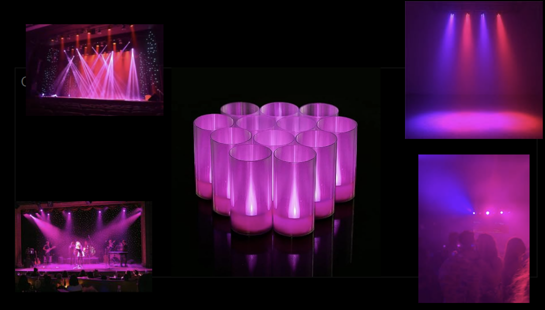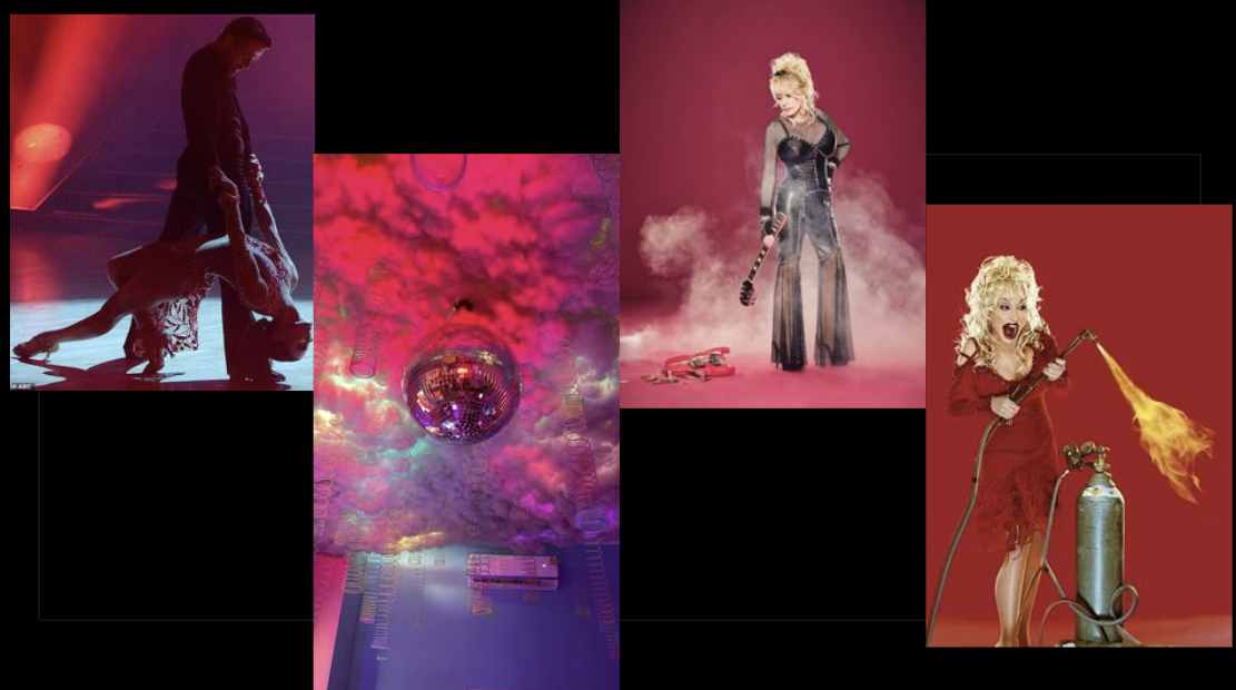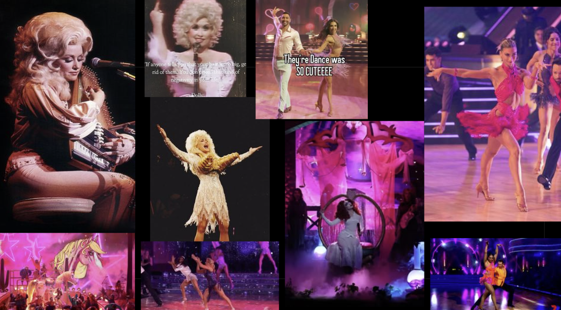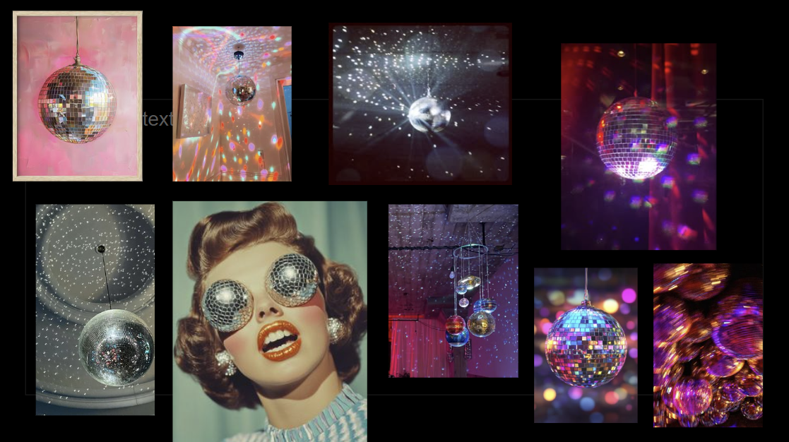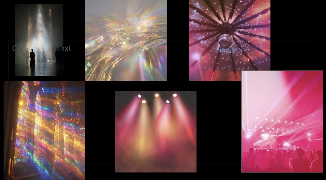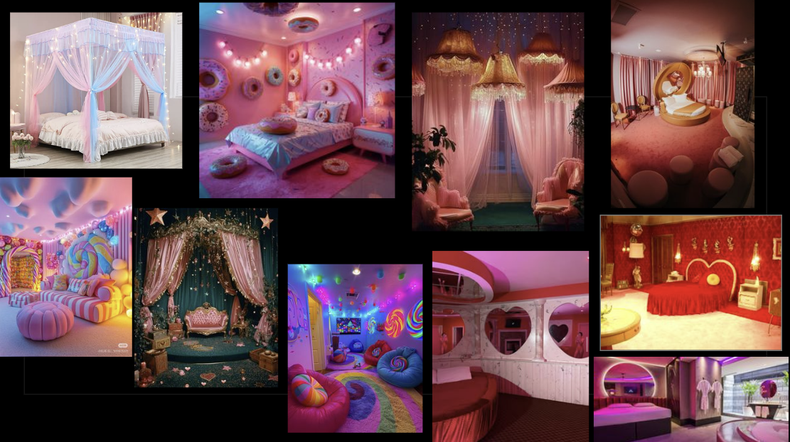 For inspiration, I drew on various shades, depictions, and textures of pink from the stage, disco ball, stained-glass window, and water lighting and reflections. I also looked into AI-generated and Pinterest candy-themed rooms for textures and layers. I felt the project relied on my understanding of how pink can be depicted. I also looked at early Dolly Parton performances, Chappell Roan’s live performance of “Pink Pony Club” at the Grammys, and Dancing with the Stars performances for the color pink, as well as different complementary shades of blues, purples, and reds that could give the pinks I was envisioning demotion. Lastly, I wanted the climax to be fun, chaotic, and a house party vibe. So, I looked into roller skating rink and arcade carpeting, disco balls, lighting, and cups to help add to the menagerie of fun chaos that I feel is what “Pink Pony Club” is.