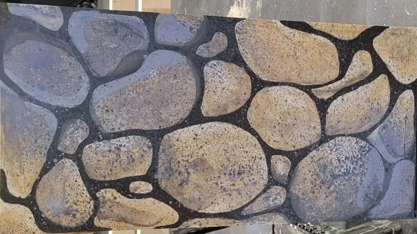 Scenic painting projects exploring texture, color, and illusion through traditional theatrical techniques. This work demonstrates hands-on experience creating realistic surfaces and environments that support storytelling through paint, material treatment, and visual depth.