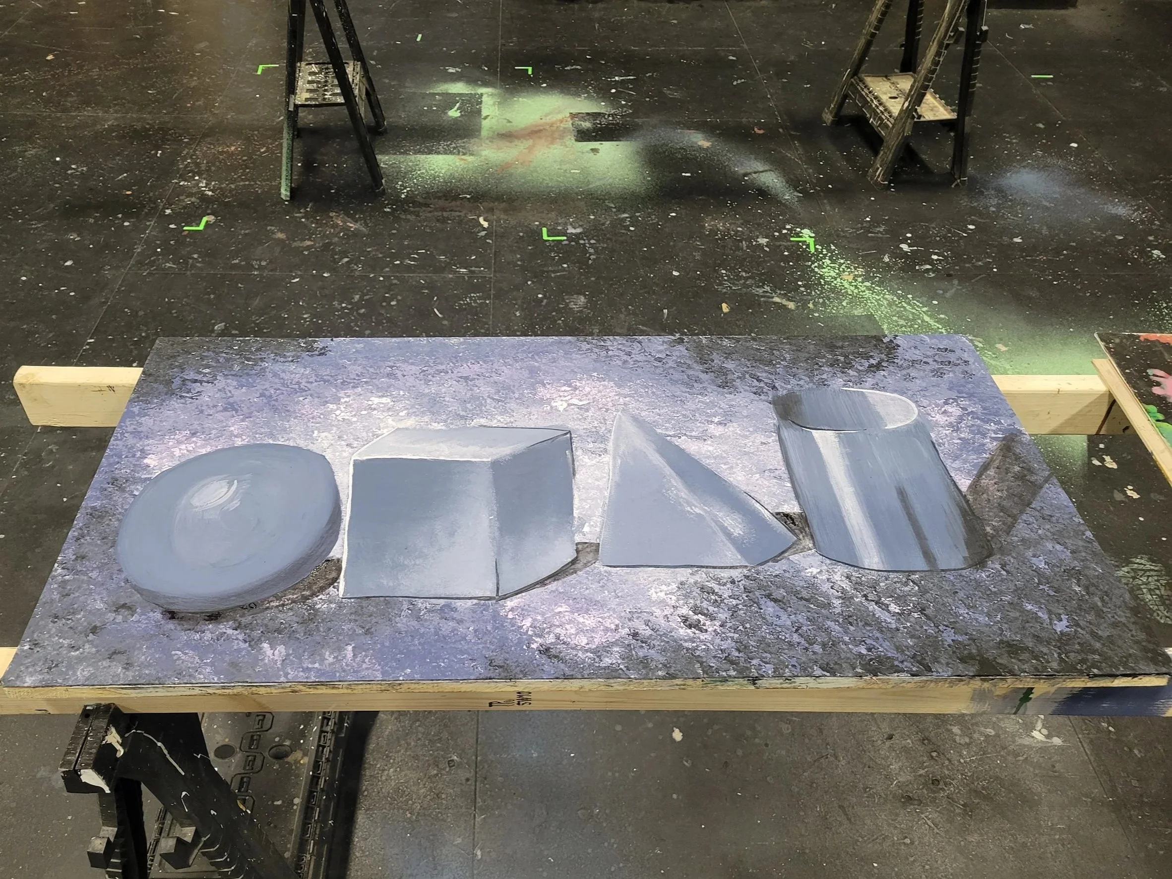 The final project for this course combined all of the techniques learned throughout the semester into a single scenic painting composition. I used spatter, sponging, wet and dry blending, and custom paint mixing to demonstrate versatility, control, and an understanding of how multiple techniques work together to create cohesive scenic surfaces.